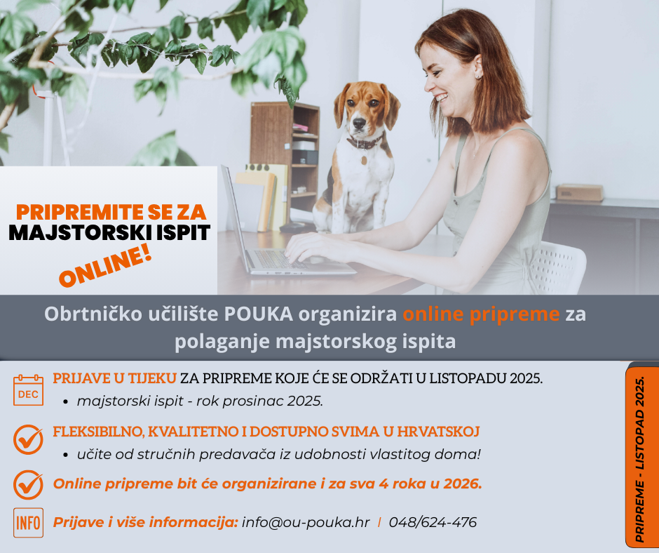 Obrtničko učilište POUKA, obrazovna ustanova Obrtničke komore Koprivničko-križevačke županije organizira online pripreme za polaganje majstorskog ispita omogućujući kandidatima da se kvalitetno pripreme za polaganje ispita iz udobnosti svog doma.